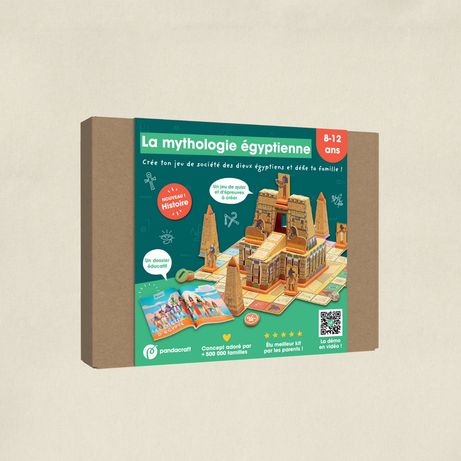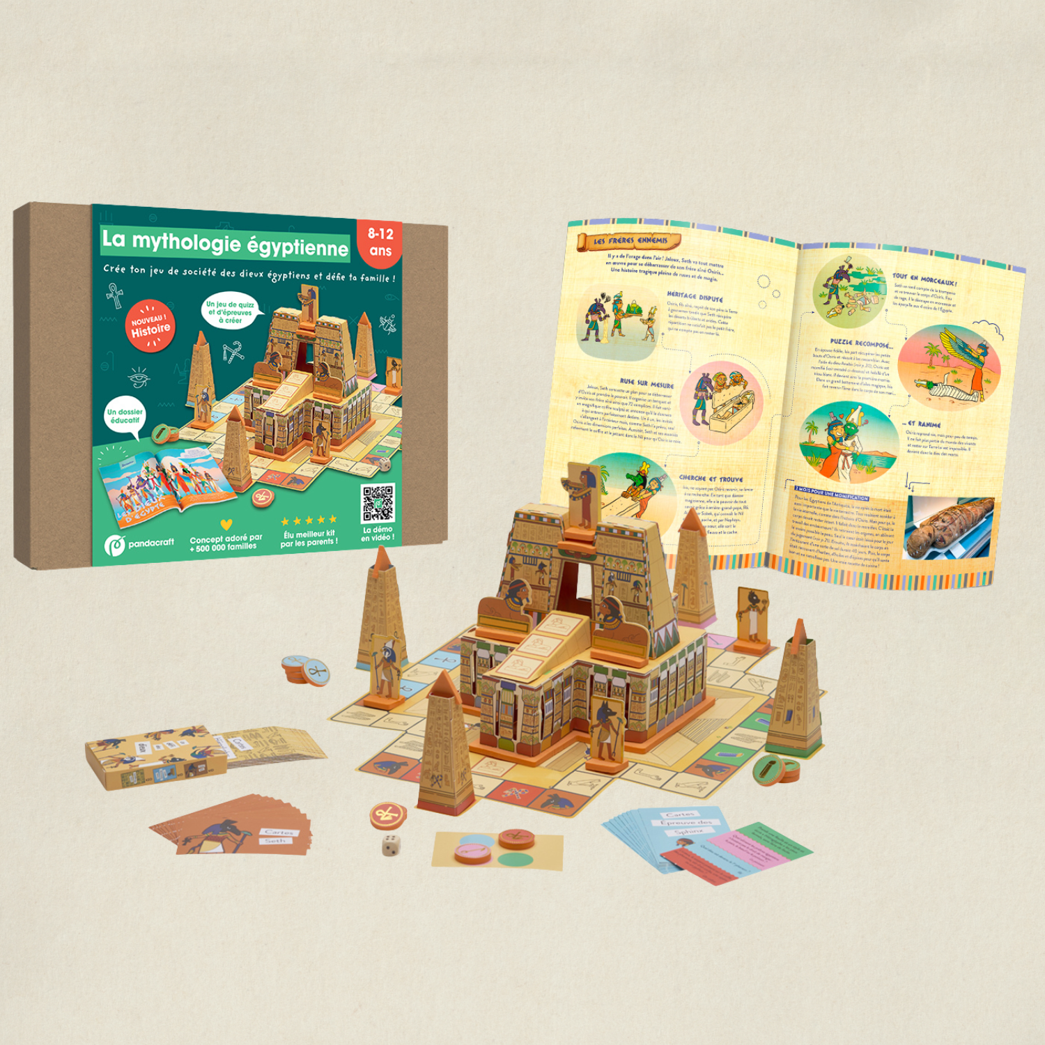 Très bonne idée pour offrir : ce kit est vendu dans une belle boite pour être plus facilement offert en cadeau ! Fabrique un jeu de plateau pour défier tes amis et ta famille ! Crée ton temple égyptien, tes colonnes et tes pions et prépare-toi pour un jeu de quizz et de défis ! Sois le premier à relever l’épreuve des sphinx et à monter tout en haut du temple pour en devenir le Dieu vénéré. Découvre les histoires des dieux de la mythologie égyptienne (Osiris, Seth, Rê, etc) et visite les temples égyptiens et comment les hommes vénéraient les dieux.