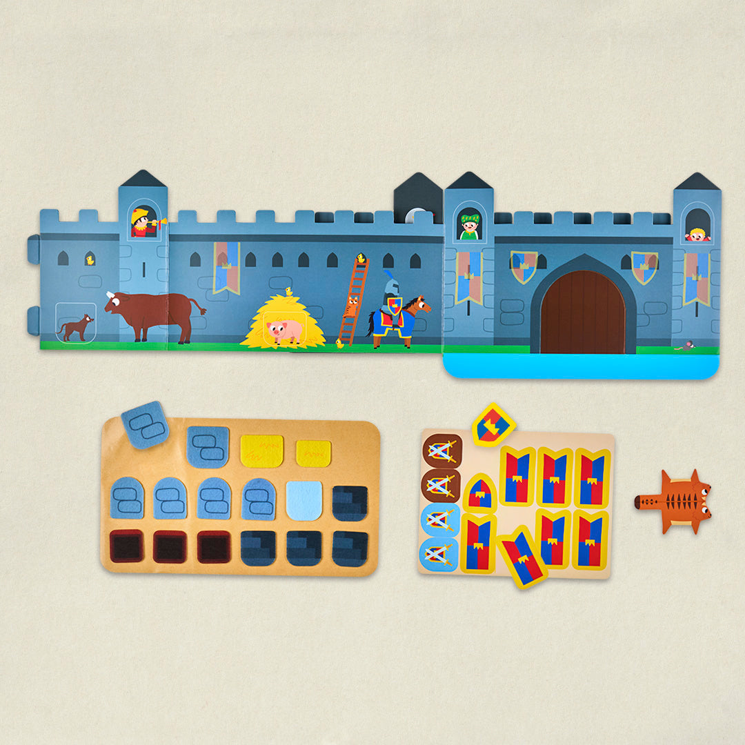 Avec ce kit, le Moyen Âge prend vie entre les mains de votre enfant !Un grand cache-cache présenté sous forme de dépliant, se transforme en véritable terrain de jeu. Grâce aux stickers en feutrine, l’enfant câche et retrouve des éléments pour exercer sa mémoire tout en apprenant le vocabulaire de position (sous, à côté…), avec plusieurs niveaux de difficulté. Dans le magazine, un petit chat guide votre enfant pour une visite inoubliable : des cuisines aux murailles, jusqu’au donjon où l’attend un chevalier. Une aventure interactive où l’enfant colle des stickers à chaque page pour participer à l’histoire.