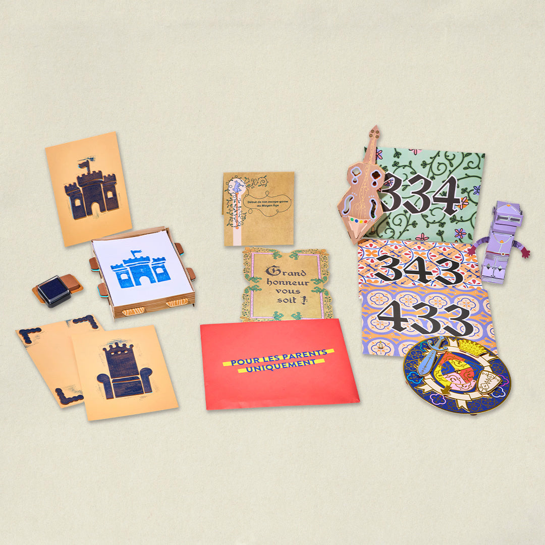 Avec l’activité plonge dans un escape game immersif : « Le vol du coffre-fort ». Équipé de ton blason à fabriquer, résous l'enquête grâce à des défis et trois créations : un papertoy de chevalier, une vièle de troubadour et ta propre machine à imprimer Gutenberg avec son tampon encreur !