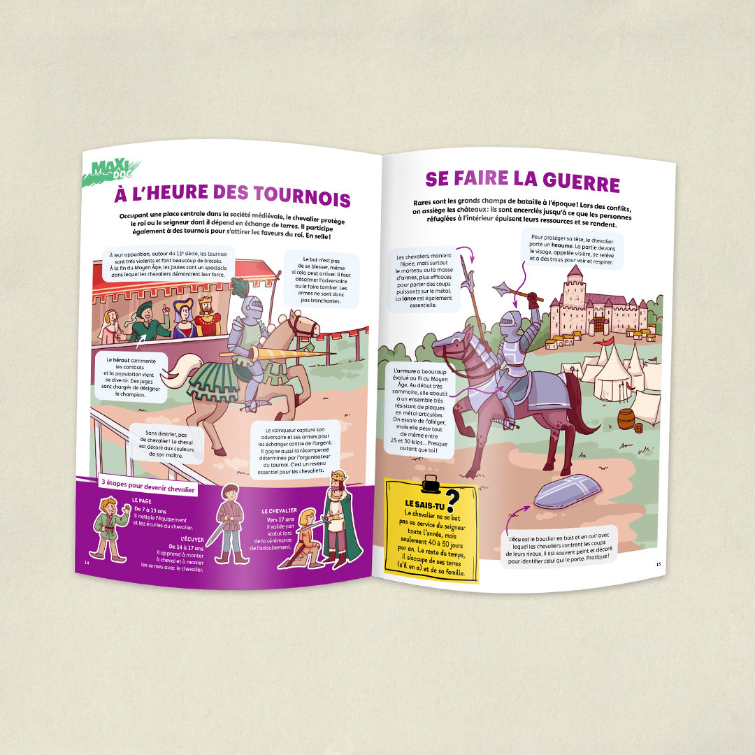 Ce mois-ci découvre les châteaux forts, apprends comment vivaient les habitants des villes et des campagnes, les métiers qu'ils faisaient et quelles grandes inventions ont marqué l’époque, comme les lunettes ou l’imprimerie.