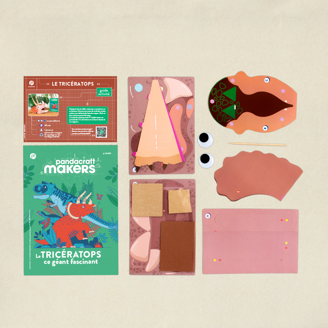 Très bonne idée pour offrir : ce kit est vendu dans une belle boite pour être plus facilement offert en cadeau ! Retourne à l'ère du Crétacé pour observer des dinosaures passionnants : les tricératops ! Explore leur environnement, leur mode de vie, leurs secrets, et les autres dinosaures qui vivaient à leurs côtés. Fabrique ton casque de tricératops pour te glisser dans la peau de l'un d'entre eux !