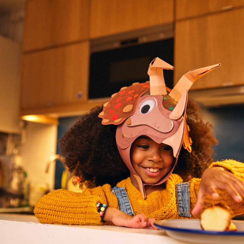 - 1 activité créative guidée pour fabriquer un casque de tricératops que tu peux porter sur ta tête